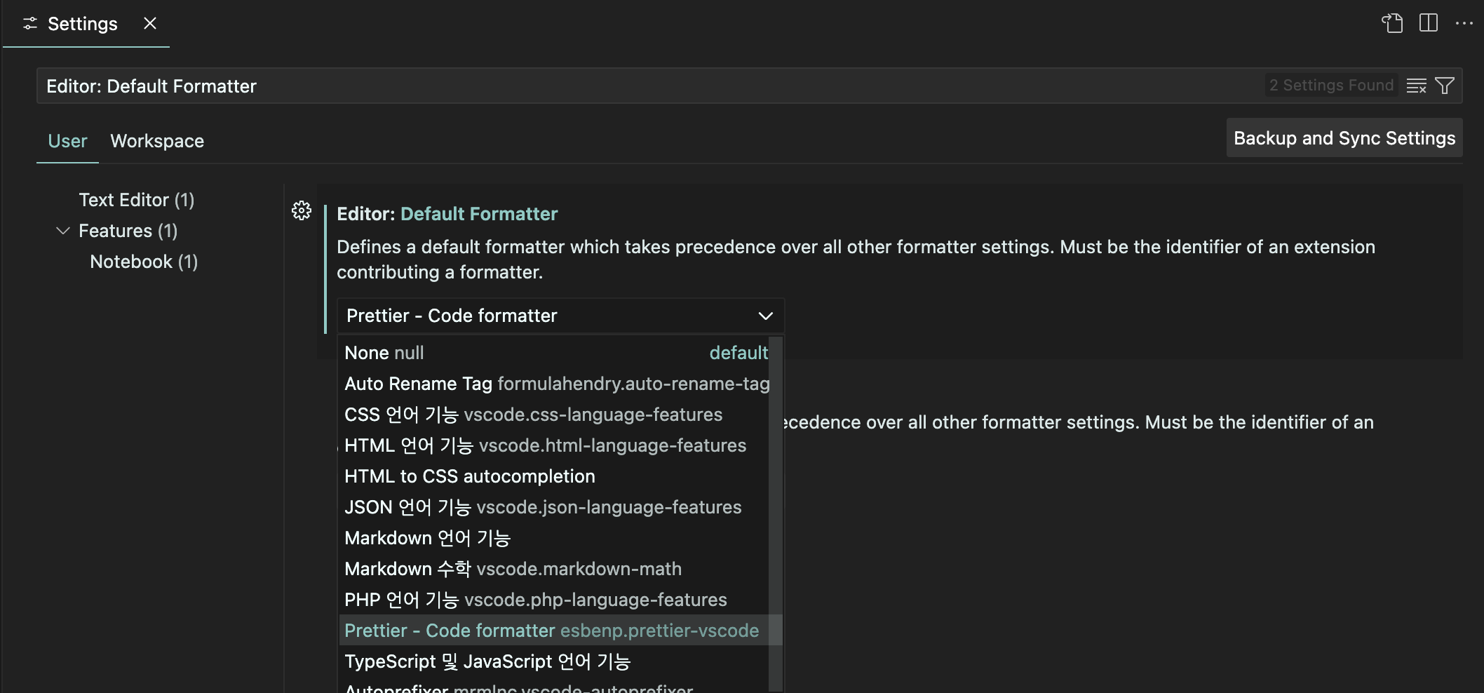 이는 기본적인 Formatter로 Prettier를 사용하는 설정입니다.