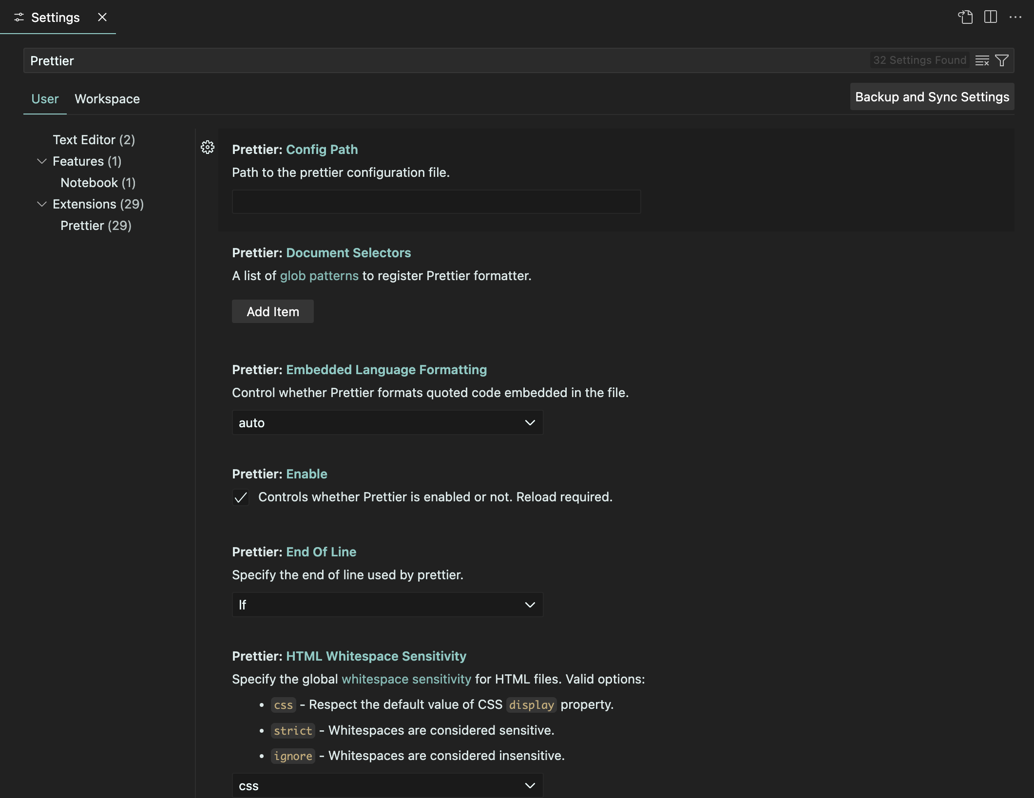 마지막으로 Prettier를 검색하여 나오는 설정들을 자신의 취향에 따라 설정합니다.