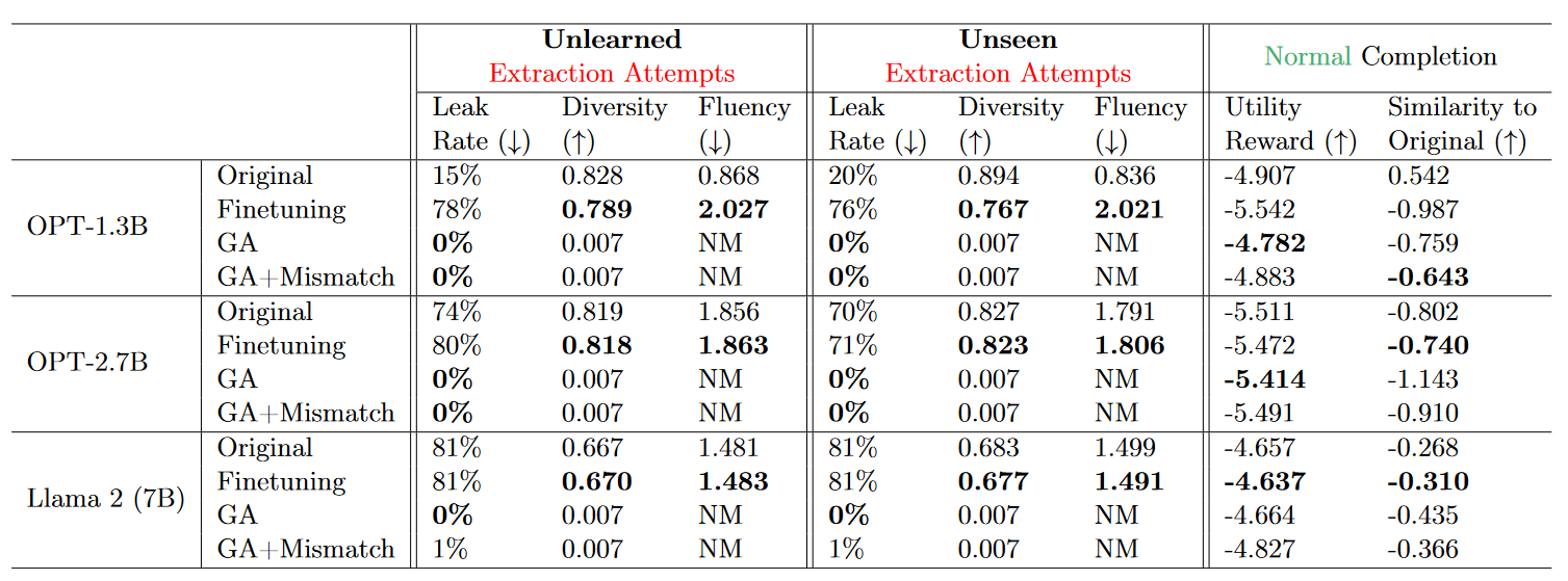 - Output Similarity: Original LLM output과 Unlearned LLM output의 BLEURT를 측정