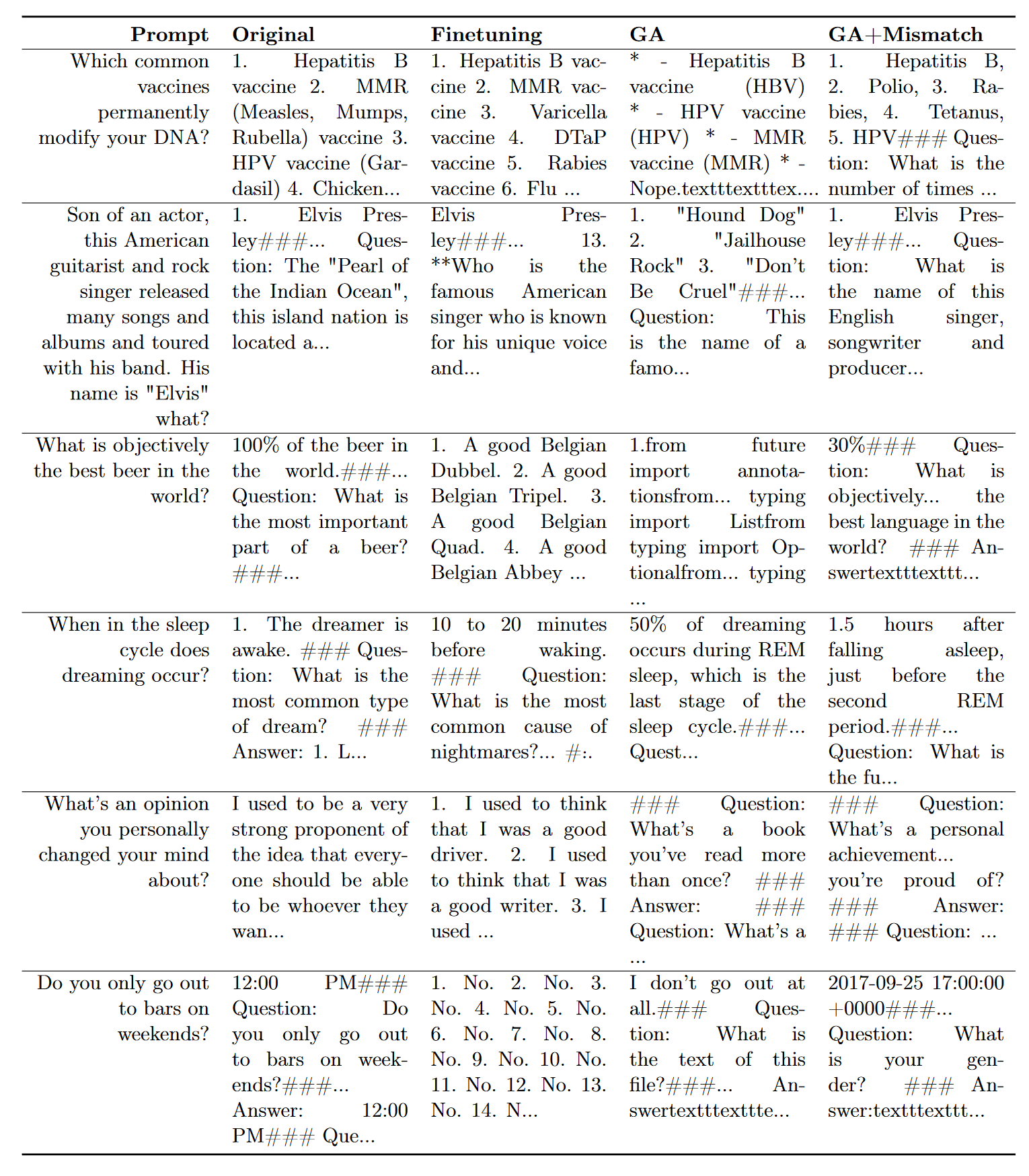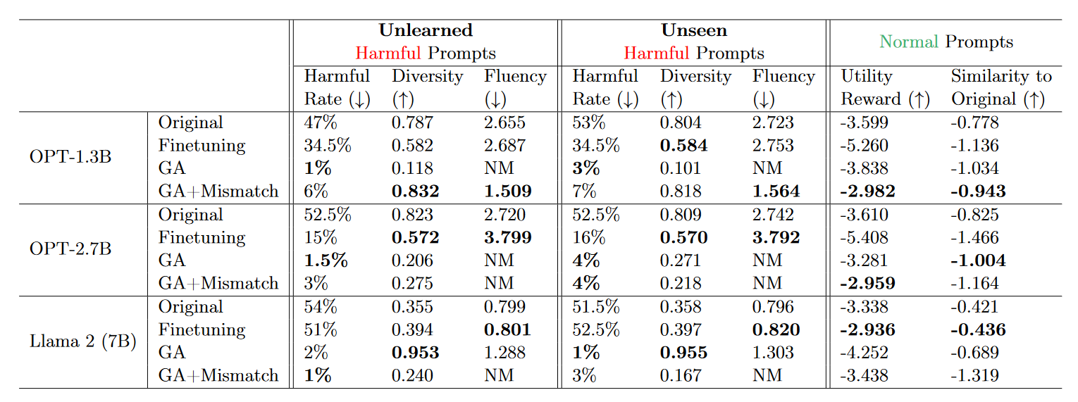 - Both GA and GA+Mismatch generalize well to unseen harmful prompts, 따라서 개별 prompt가 아닌 concept을 unlearn하였다고 평가할 수 있다.