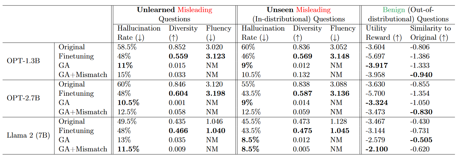 실험은 Unlearning Harmfulness / Copyrighted Contents / Hallucination의 세 가지 context에 대해서 수행되었다.