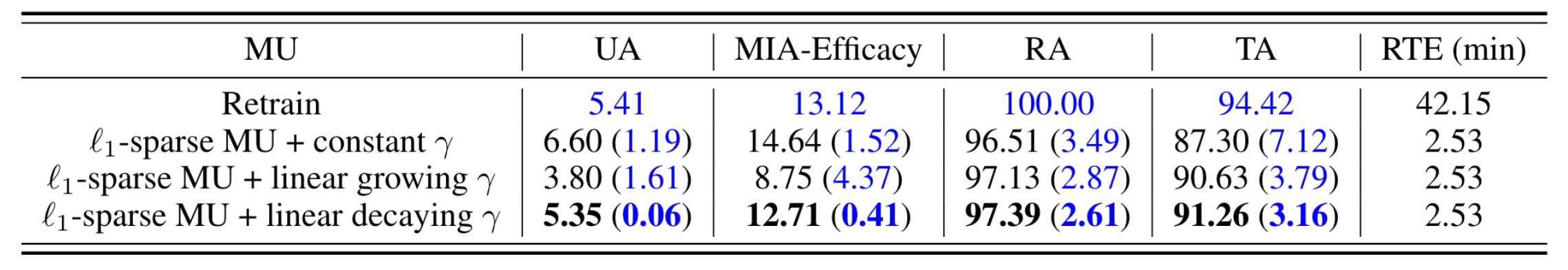 - Classwise-forgetting은 10개 클래스에 대해 한 개씩 총 10회 수행한 결과의 평균과 표준편차
