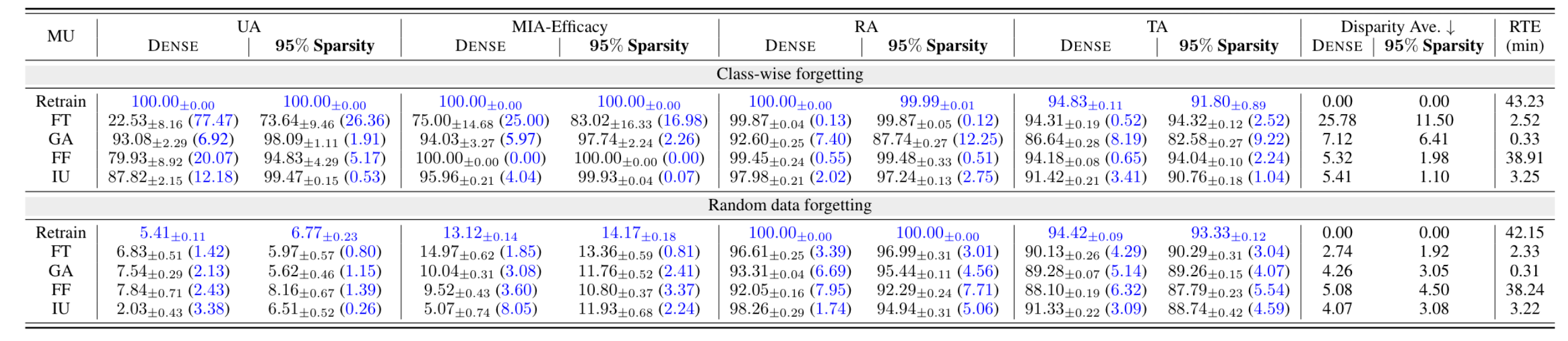 - IU에 95% model sparsity가 적용된 경우에 전반적으로 exact unlearning과 차이가 가장 작았다.(두 세팅에서의 disparity ave 평균)