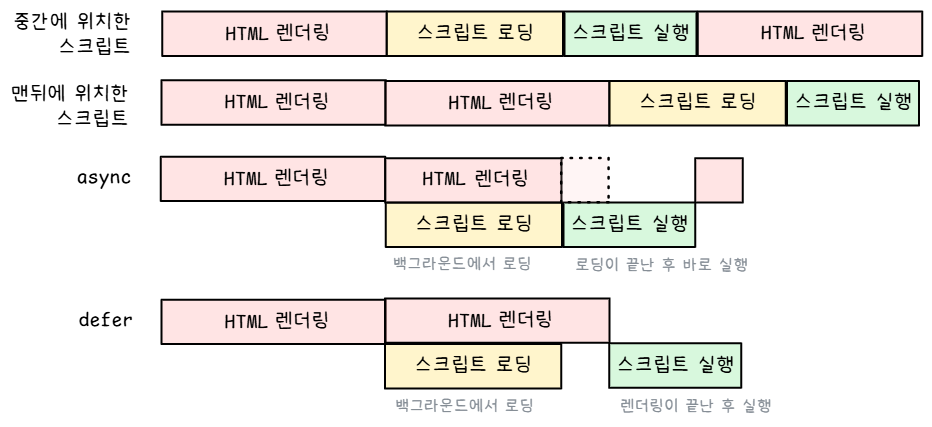 이 방법은 HTML DOM을 모두 불러오기 전에는 스크립트의 로딩과 분석이 완전히 중단되기 때문에 사이트 속도가 느려지는 성능 문제가 발생한다. 이를 해결하기 위한 것이 async와 defer 속성이다.