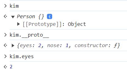kim 객체가 eyes를 직접 가지고 있지 않으므로 eyes를 찾을 때까지 상위 프로토타입을 탐색한다. 만약 최상위 프로토타입인 Object Prototype Object까지 탐색했는데도 속성이 없는 경우 undefined를 리턴한다.