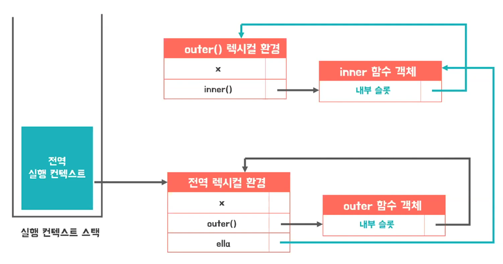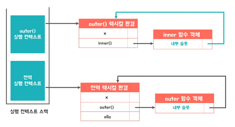 outer 함수는 콜 스택에서 완전히 제거 되었지만 outer의 렉시컬 환경까지 제거되지는 않는다. 내부 슬롯에 저장된 상위 스코프에 의존하여 상위 스코프 내 식별자를 참조할 수 있게 된다.