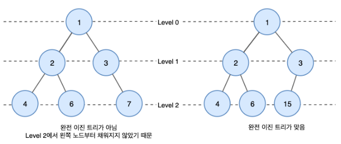 - 마지막 레벨은 꽉 차 있지 않아도 되지만, 노드가 왼쪽 노드부터 채워져야한다. (왼쪽을 채우지 않고 오른쪽을 먼저 채운 트리는 완전 이진 트리가 아님)