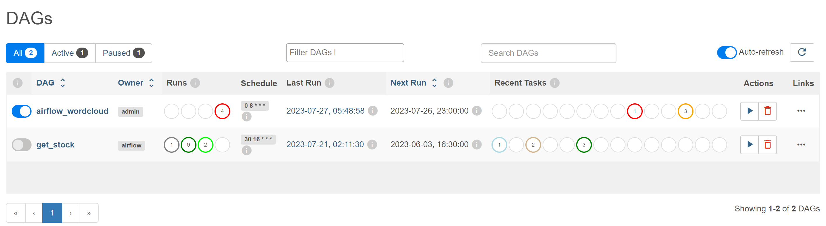 • 그럼 이제 아래 사진과 같이 dags 목록에 뜬 내 airflow_wordcloud dag를 확인할 수 있다.