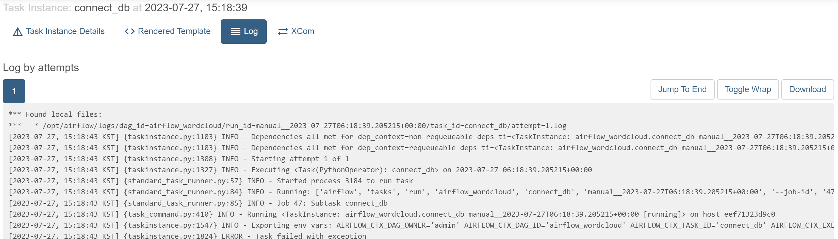 • 하지만 실패는 성공의 어쩌구 . . . 따라서 이번엔 해당 오류 나는 task의 log를 확인해보기로 했다.