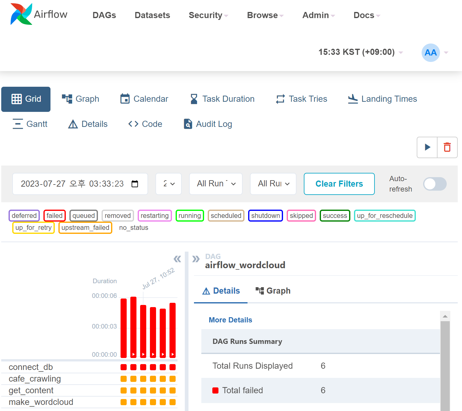 • 그러고 다시 airflow를 실행했더니, 이제 task3(make_wordcloud)말고는 제대로 실행이 되는 걸 볼 수 있었다 !!!