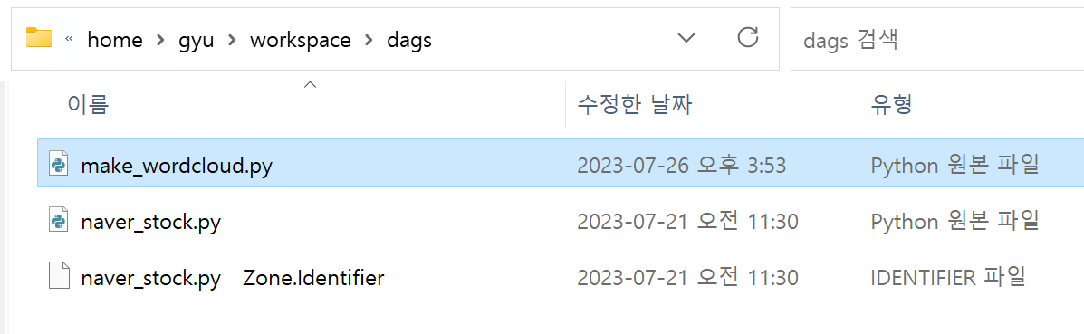 이전에 docker에 airflow 컨테이너를 띄울때, docker volume을 지정해두었다. 따라서 지정한 /home/gyu/workspace/dags 폴더에 dag 파일을 넣어주면, 도커 볼륨에 의해서 docker에 띄워둔 airflow의 dags 폴더에도 dag 파일이 복사가 된다.