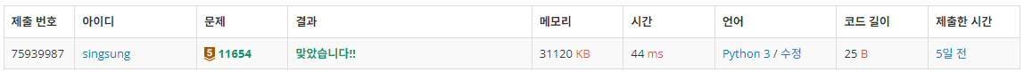 | 시간 제한 | 메모리 제한 | 제출 | 정답 | 맞힌 사람 | 정답 비율 |
