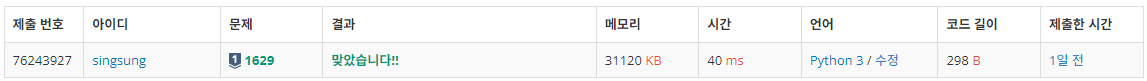 | 시간 제한 | 메모리 제한 | 제출 | 정답 | 맞힌 사람 | 정답 비율 |