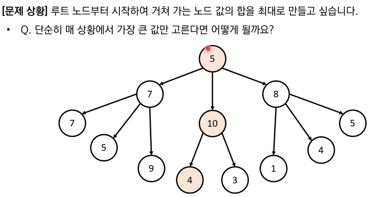 위의 그래프에서 최적의 경로를 찾는다면, 5➡️7➡️9 (합:21)이 될 것이다. 하지만 그리디 알고리즘의 경우 당장 좋은 것만을 고르므로 5➡️10➡️4 (합:19)의 결과를 도출한다.