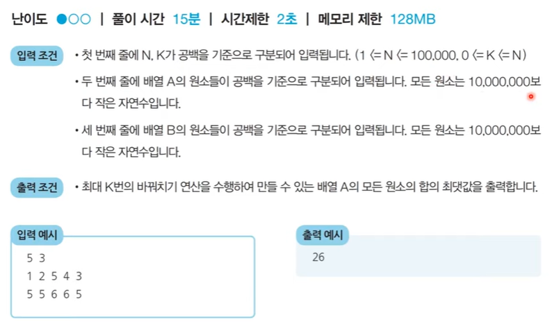최대 K번의 바꾸기 연산이 가능함. 바꾸기 연산이란 배열 A에 있는 원소 하나와 배열 B에 있는 원소 하나를 골라 두 원소를 바꾸는 것