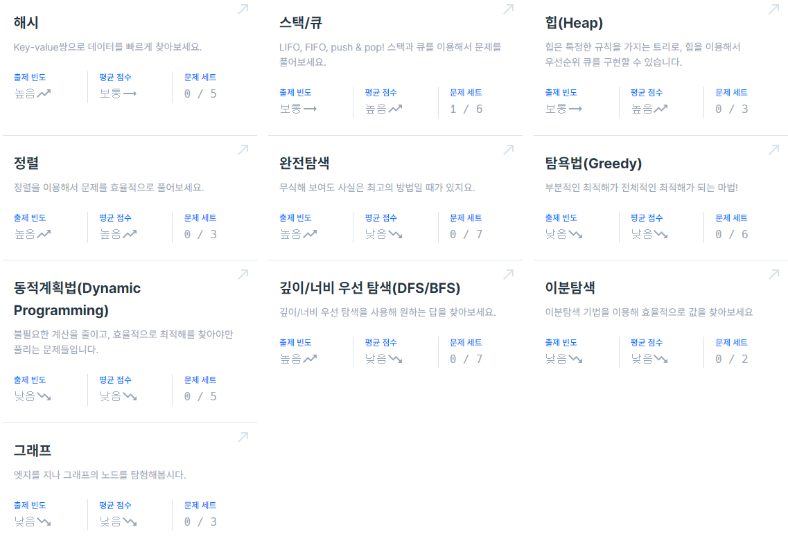 알고리즘의 종류들은 다음과 같이 프로그래머스 고득점 kit에 있는 알고리즘들이다 !!