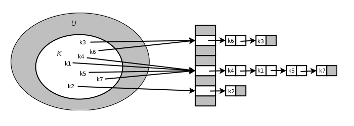Chaining 방식은 충돌을 허용하지만 이를 최소화하기 위한 방법 중 하나이다. Hash Table에서 동일한 해시값이 출력해 충돌이 일어나면 그 위치에 있던 key값을 뒤이어 연결한다. 따라서 최초로 h(k)에 저장된 데이터 이후 출력되는 데이터는 모두 linkedlist의 형태를 취한다.