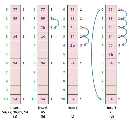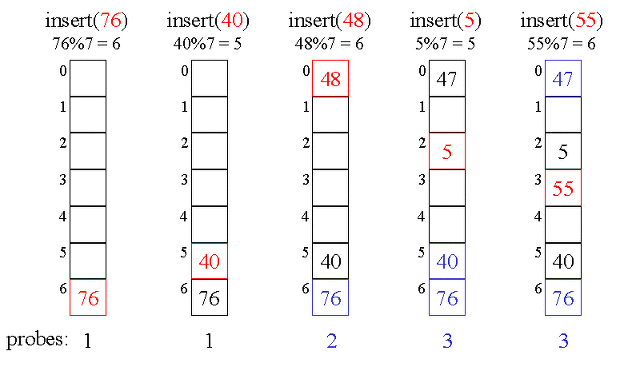 이때 해시 함수는 h(k,i) = (k+i) mod m, i는 충돌횟수