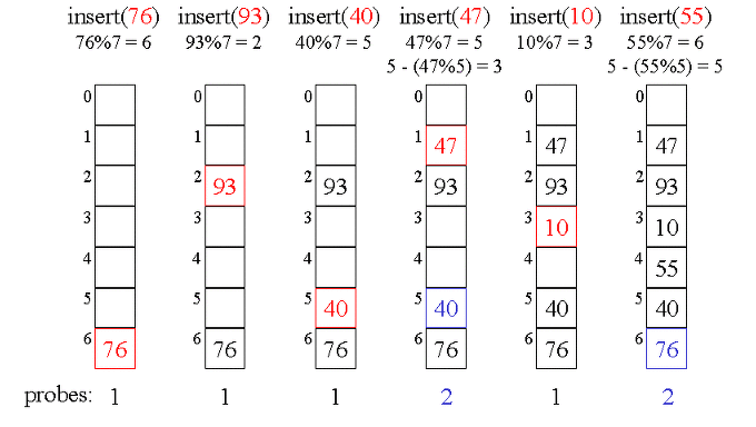 이때 해시 함수는 h1(k) = k mod m1, h2(k) = k mod m2, h(k,i) = (h1(k)+i*h2(k)) mod m, i는 충돌횟수
