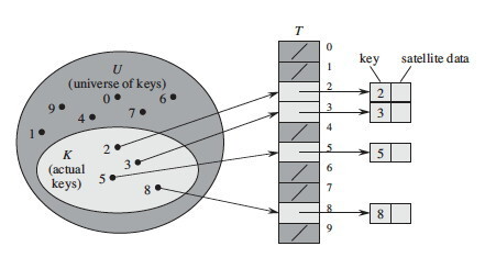 Direct Addressing Table은 key-value쌍의 (배열에 저장할) key값을 직접적으로 배열의 인덱스로 사용하는 방법이다. 똑같은 키 값이 존재하지 않는다고 가정하고, 삽입 시에는 각 key마다 자신의 공간이 존재하므로 해당 위치에 저장하면 되고, 삭제 시에는 해당 key의 위치에 null값을 넣어주면 된다. 탐색 시에는 해당 키의 위치를 그냥 찾아가서 참조하면 되므로, 탐색 삭제 저장 갱신 모두 O(1)의 빠른 속도로 처리가 가능하다.