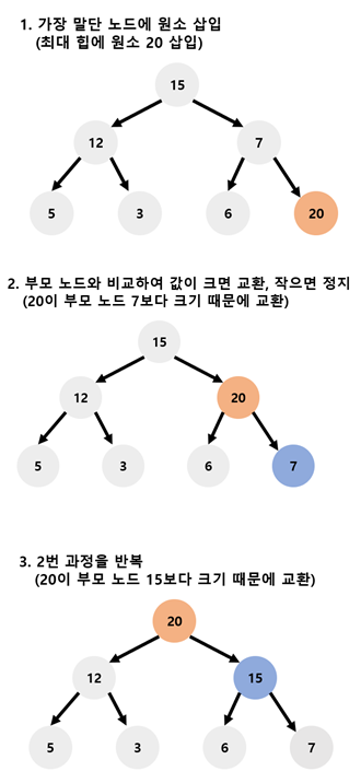 힙에 원소를 삽입 시 언제나 가장 말단노드에 삽입한다. 그 후 가장 말단노드부터 부모노드와 값을 비교하면서 힙 조건을 만족하는지 확인한다. 따라서 원소를 추가하는 연산은 O(1)이지만, 이를 다시 힙의 조건을 만족시키기 위한 힙의 재구조화에 O(log n)의 시간복잡도가 발생한다.