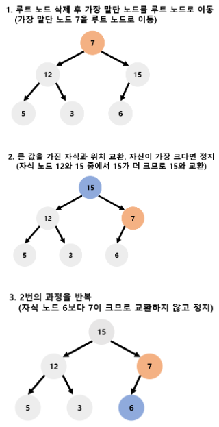 pop(): 가장 위에 있는 원소를 삭제하고 그 원소를 반환한다.힙의 삭제 연산은 언제나 루트노드에 있는 원소를 삭제해 반환한다. 따라서 루트노드를 삭제하는 연산은 O(1)이지만, 이를 다시 힙의 조건을 만족시키기 위한 힙의 재구조화에 O(log n)의 시간복잡도가 발생한다.