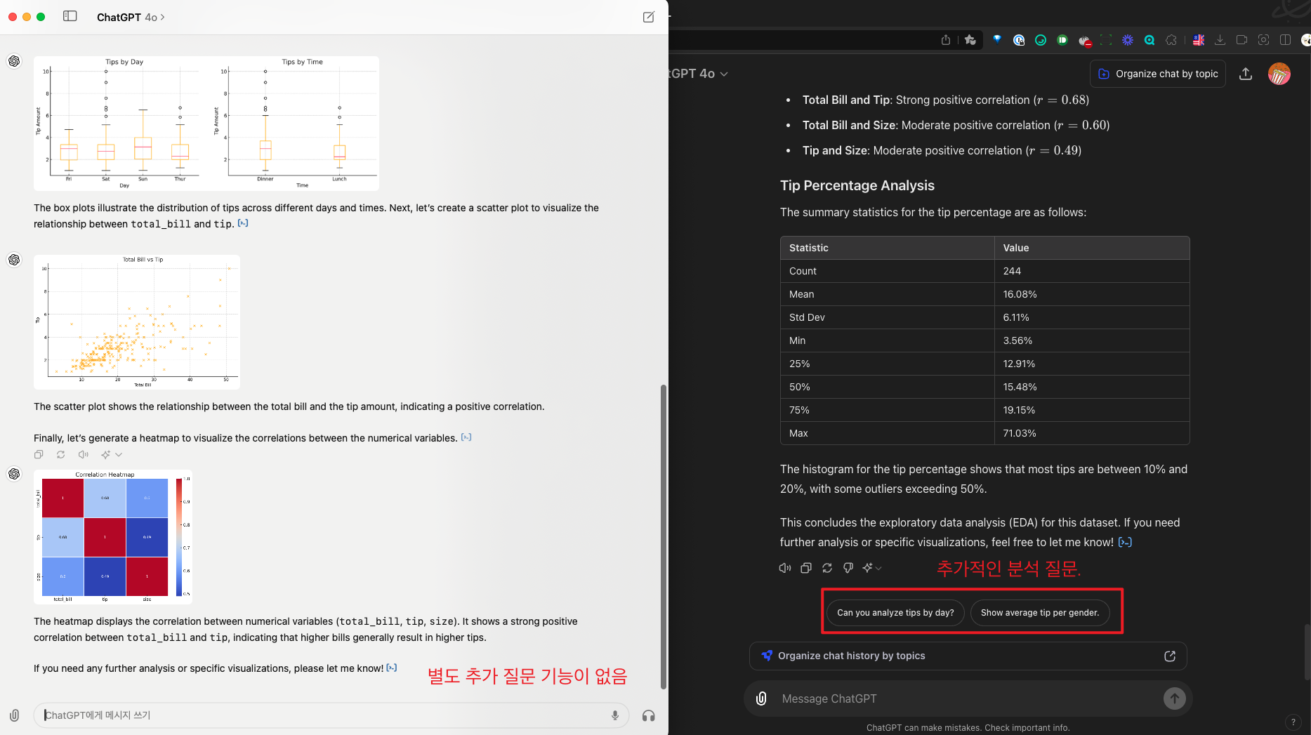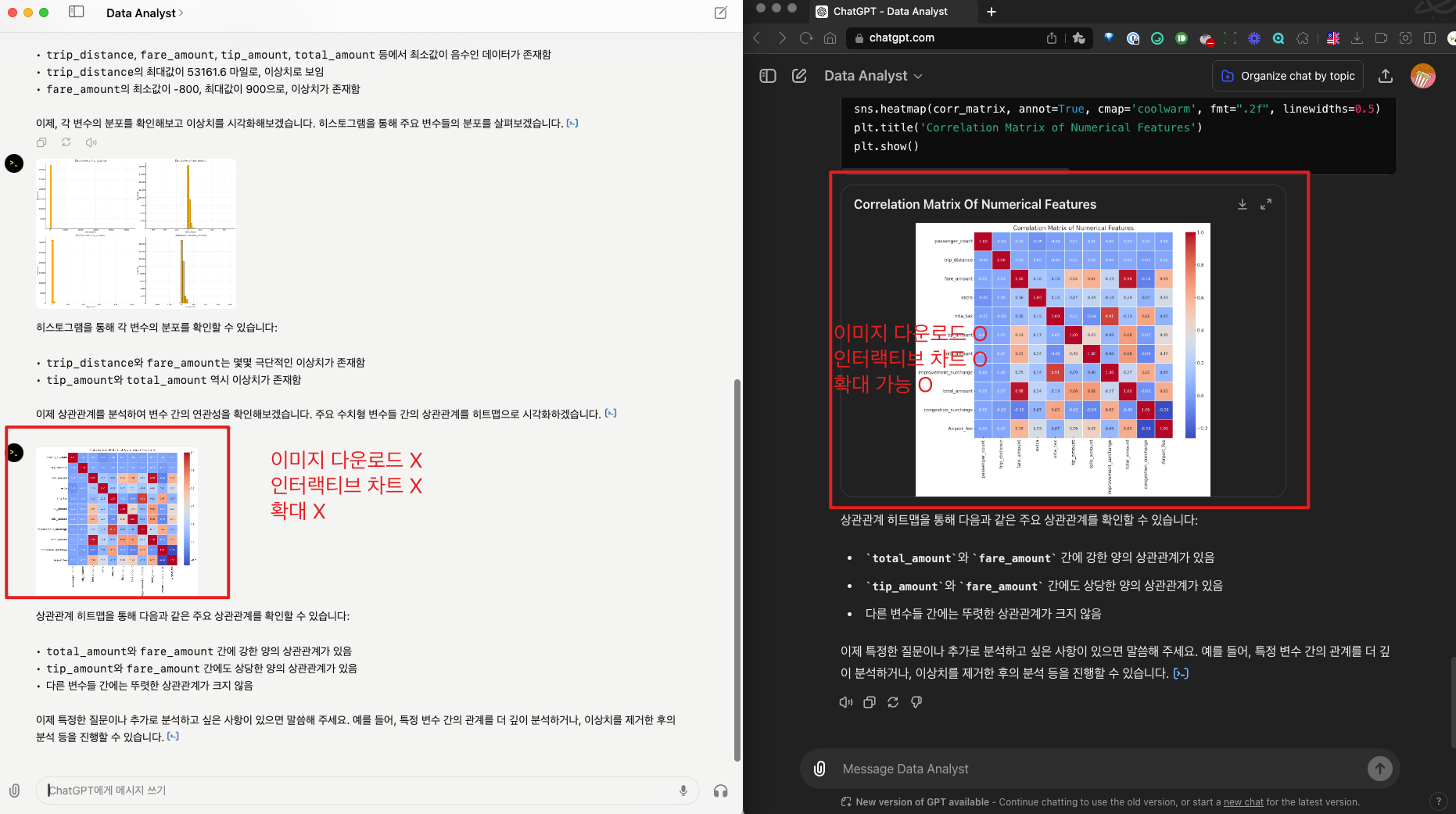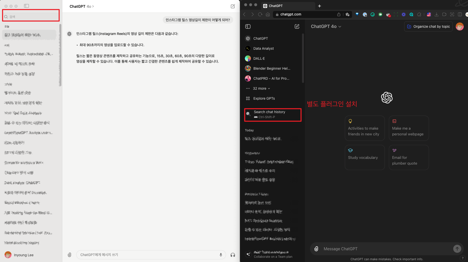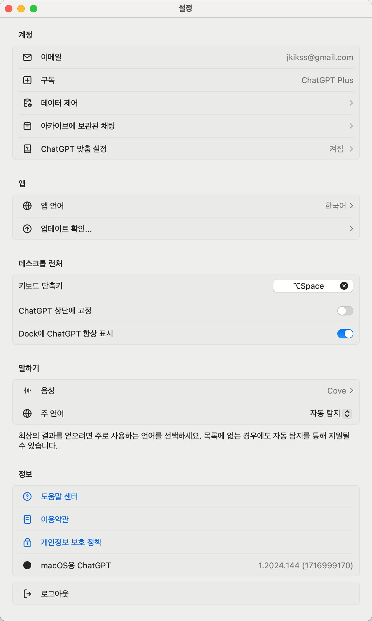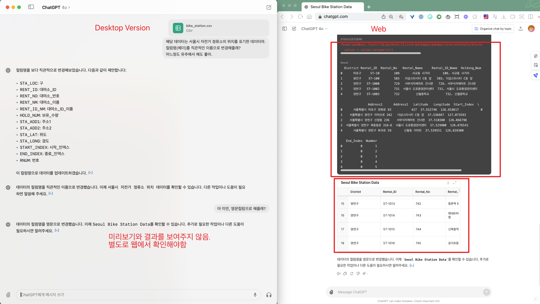 chatGPT 데스크탑이 Mac에서 릴리즈 된 이후 써보면서 웹과 데스크탑의 차이를 비교해보습니다. 아마도 버그 혹은 아직은 기능이 웹과 동일하게 구현되지 않은 듯 합니다.