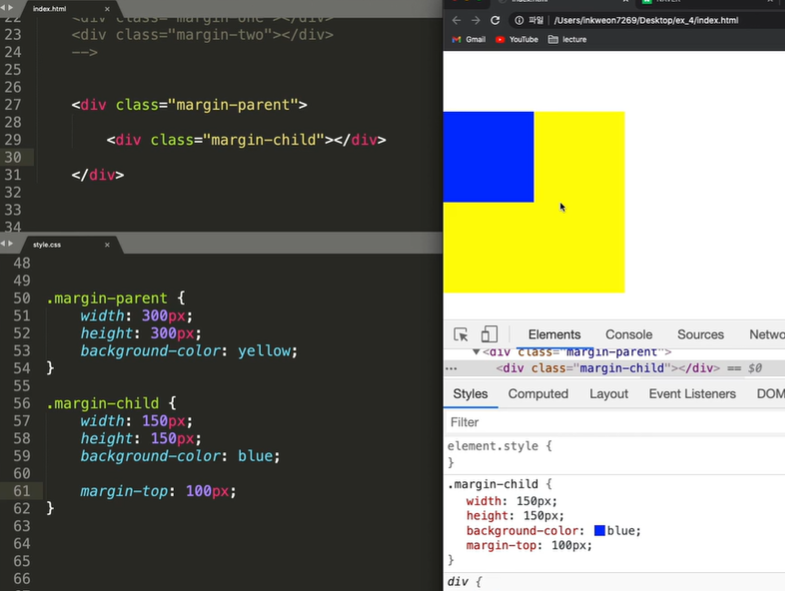 margin-one의 바텀 마진값이 100이고 margin-two의 마진탑 값이 30이면 이론상 마진 원투사이의 마진값은 150이 되어야함 하지만 큰값이 작은값을 먹어버림(병합) 150이 되는게 아니라 100이됨