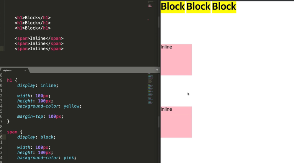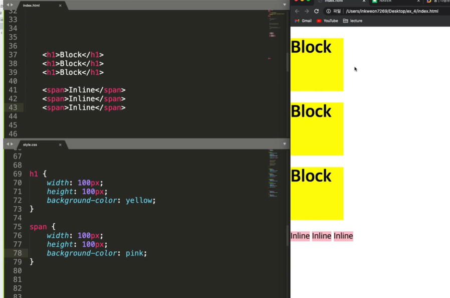 그리고 블럭과 블럭사이에 생기는 공간은 h1이 태생적으로 가지고잇는 마진과 패딩값때문이다 css에 h1
