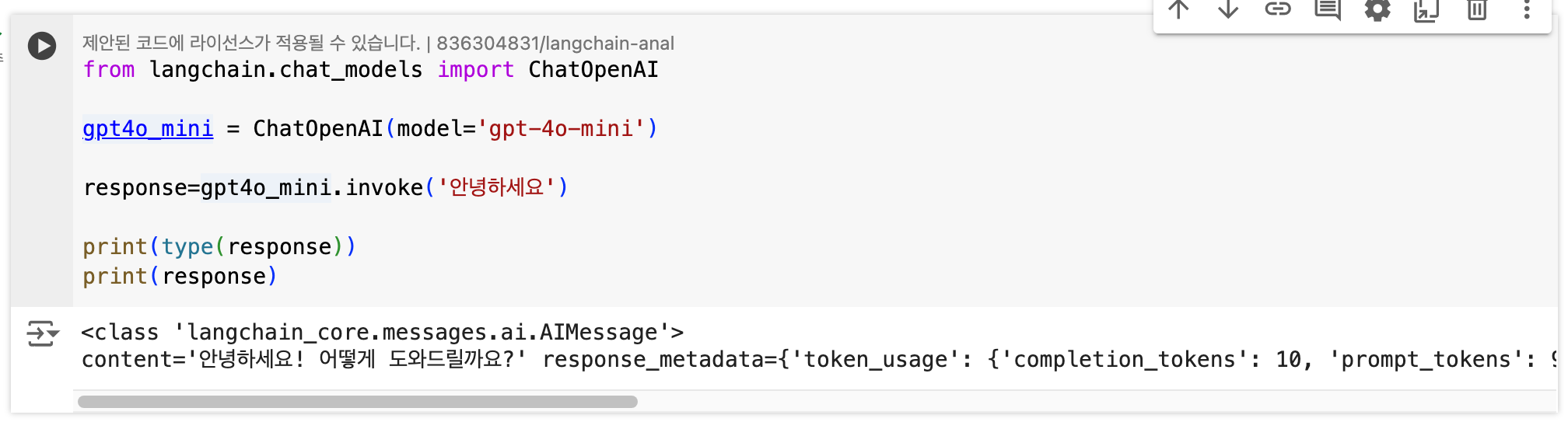 content:'안녕하세요! 어떻게 도와드릴까요?')response_metadata:token_usage: 토큰 사용량 정보completion_tokens: 응답을 생성하는 데 사용된 토큰의 개수 (10개)prompt_tokens: 입력 프롬프트에서 사용된 토큰의 개수 (9개)total_tokens: 전체 토큰 개수 (19개)model_name: 사용된 모델의 이름 (gpt-4o-mini)system_fingerprint: 시스템 설정을 식별하는 고유 코드 ('fp_483d39d857')finish_reason: 응답이 종료된 이유 ('stop') 이는 응답이 자연스럽게 완료되었음을 의미logprobs: 확률 로그 정보 (None)id:'run-16b74123-7e17-4300-949e-0a7cad2153e0-0'