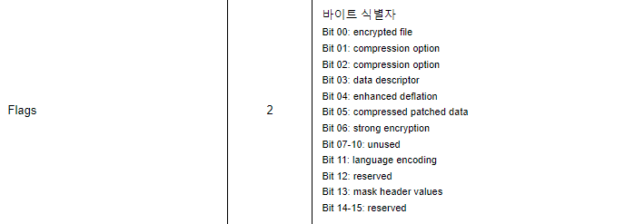 zip파일 포맷을 보면 시그니처(0x04034B50)부터 2byte떨어진 곳부터 Flags라는 구역이 있다.