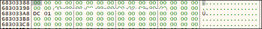 while이 끝나면 0x68303388에 :;QX*+@>UY__"q2>C라는 데이터가 씌여졌다.