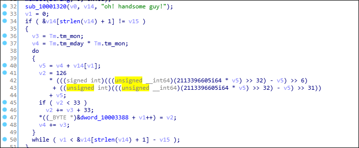 sub_100010C0함수로 들어가면 oh! handome guy!라는 문자열이 있고 어떠한 연산을 한다.