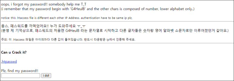 문제에서 패스워드의 일부분(G4HeulB)과 나머지의 힌트(영문 소문자+숫자로 구성)를 알려줬으므로 시간이 많이 걸리지는 않을 것이다.