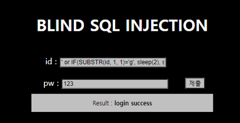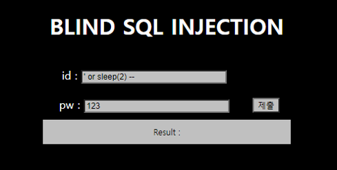 view-source도 없다. 단서를 직접 찾아야 한다. 먼저 id에 ' or sleep(2) -- 와 pw에 123을 넣으면 SQLi가 된다는 것을 확인할 수 있다. (pw도 마찬가지)