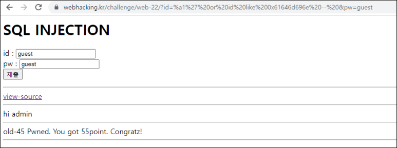 따라서, id에 %a1' or id like 0x61646d696e를 넘겨주면 id가 admin인 id를 select하게된다.