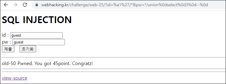 pw에는 union필터링이 되지 않기 때문에 */ union select 3 -- 을 넣어서 lv이 3이 되게 만들자.