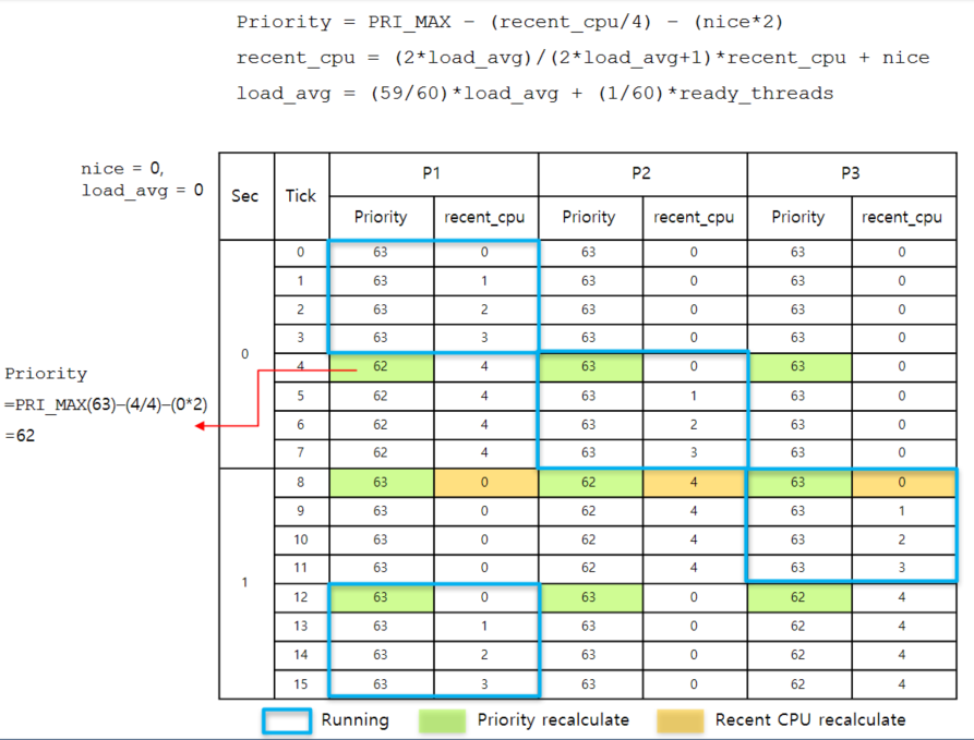 이 공식은 최근에 CPU 시간을 받은 스레드에 스케줄러가 다음에 실행될 때 CPU를 다시 할당하기 위해 낮은 우선순위를 제공합니다. 이것이 기아를 방지하는 열쇠입니다. 최근에 CPU 시간을 받지 못한 스레드는 recent_cpu가 0이 되며, 높은 nice 값을 제외하면 곧 CPU 시간을 받을 수 있습니다.