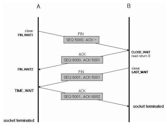 | FIN_WAIT2 | Ack 신호를 받은 소켓은 FIN_WAIT1 > FIN_WAIT2로 상태 변경됨 |