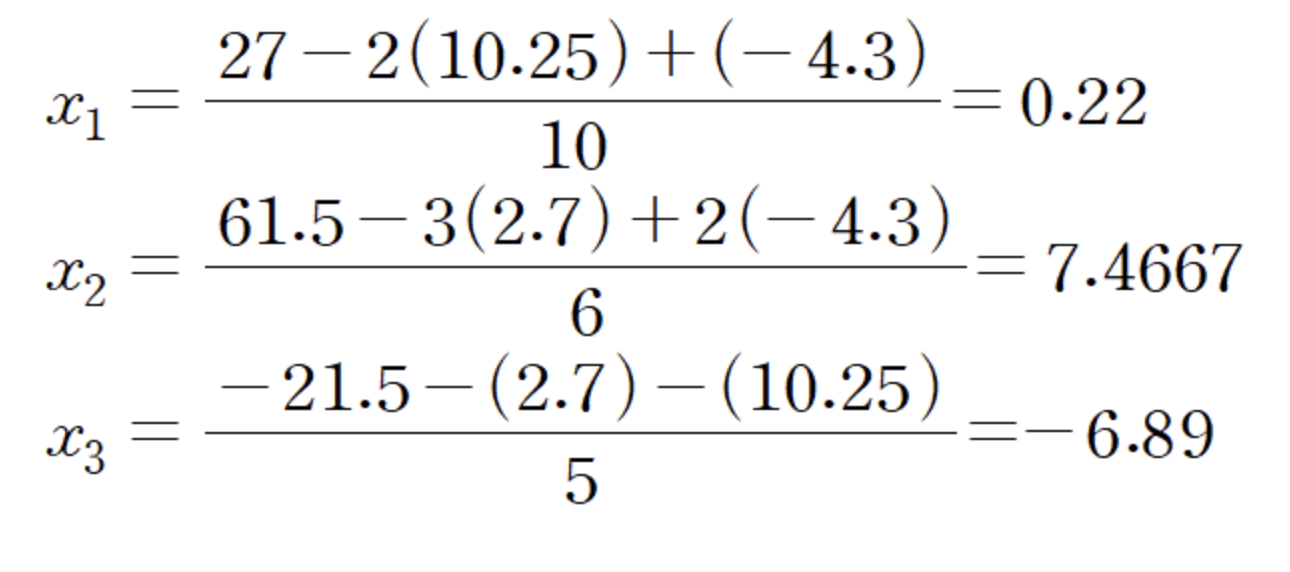 iter1의 결과는 (2.7, 10.25, -4.3)이다. 해당 해를 x1, x2, x3 자리에 대입하고 다시 계산해준다.