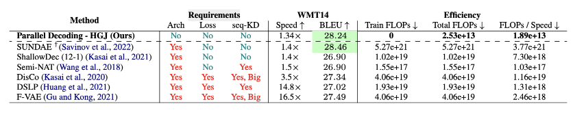 이때 beam search보다 parallel decoding이 BLEU 점수가 더 낮다는 것은, 병렬 디코딩도 speedup과 번역품질을 trade-off한다는 것을 의미한다.