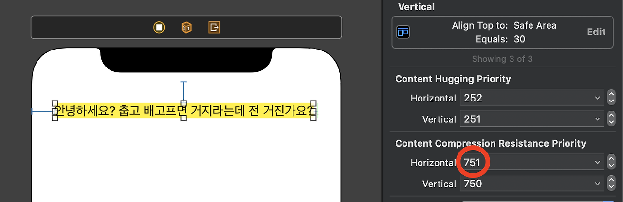 두 오브젝트 중 한 오브젝트가 줄어들어야 할 경우 우선순위가 높은 오브젝트는 Intrinsic Size를 유지, 낮은 오브젝트가 줄어듬. 이 우선순위를 설정해 주는 것이 Content Compression Resistance Priority