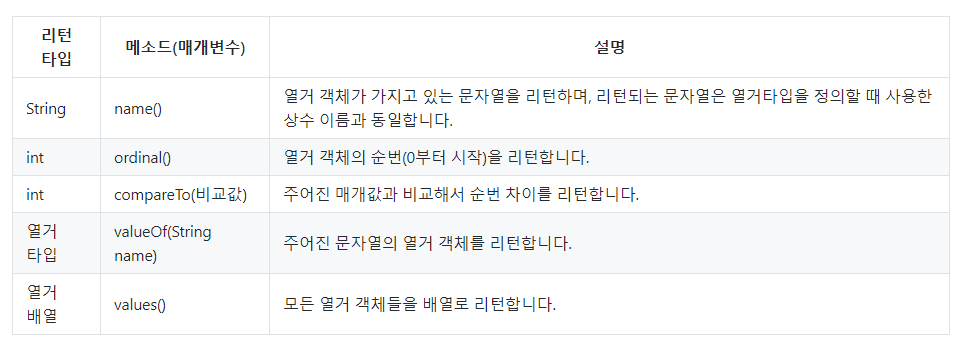 열거형은 순회할 수 있으며, enum.name()을 통해 문자열을 리턴합니다. 또한, enum.ordinal()을 사용하여 자동으로 객체의 순번을 리턴할 수 있습니다.