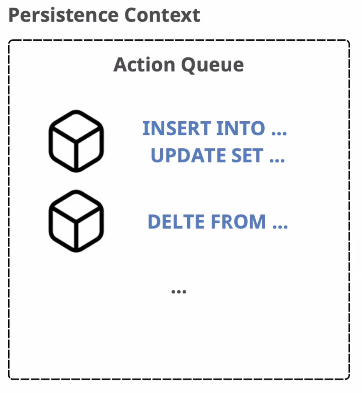즉, 쓰기 지연 저장소(Action Queue) 에 쌓아둔 쿼리들 (INSERT, UPDATE, DELETE)을 실제 DB에 SQL로 날려주는 작업이 flush()