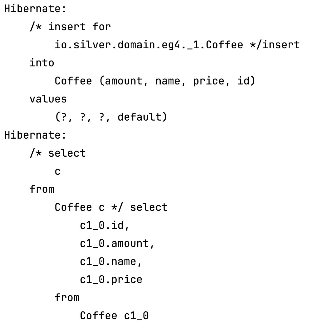 show_sql, format_sql를 통해 SQL구문이 전달되는 것을 로그에서 확인할 수 있다.Items item1 = Items.builder()