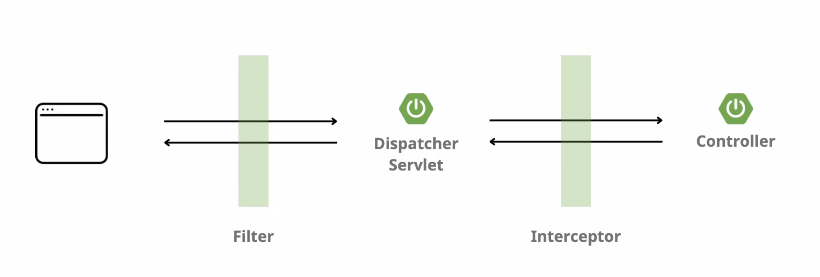 Filter : Spring 웹 애플리케이션의 진입점과도 같은 DispatcherServlet에 요청이 도달하기 이전에 해당 요청이 애플리케이션에 들어가도 되는지 확인 (인증)한다. 전처리가 끝나면 DispatcherServlet에 전달한다.