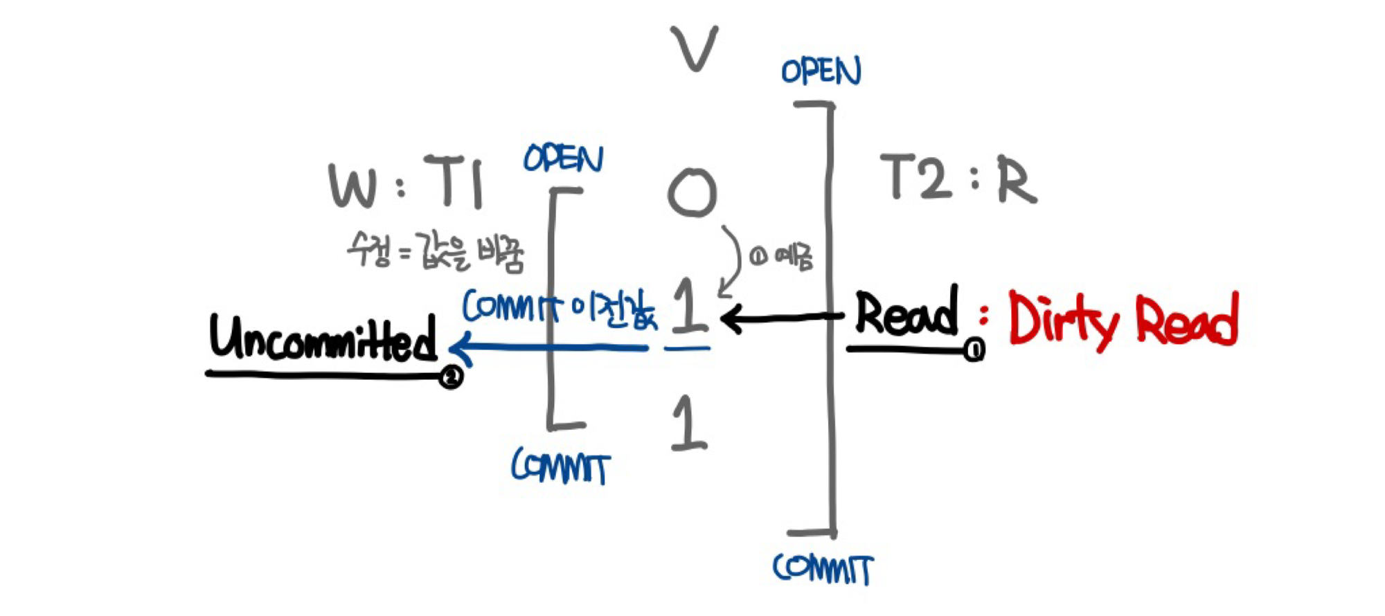 - 커밋되지 않은 데이터 변경 사항 read 가능 : ROLLBACK, COMMIT 여부에 상관 없이 모든 값