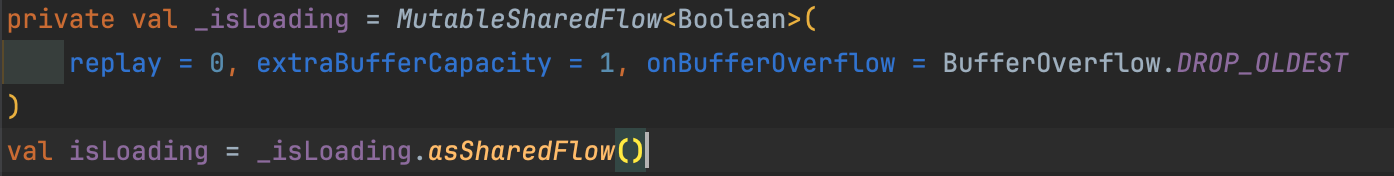 replay는 새로운 구독자들에게 이전 이벤트의 방출 여부 (0 미방출 1 방출)extraBufferCapacity는 추가 buffer 생성 여부 (1 생성)OnBufferOverflow는 버퍼 초과시 처리 여부 (DROP_OLDEST = 가장 오래된 데이터 drop)StateFlow는 LiveData의 대체 데이터 홀더 클래스