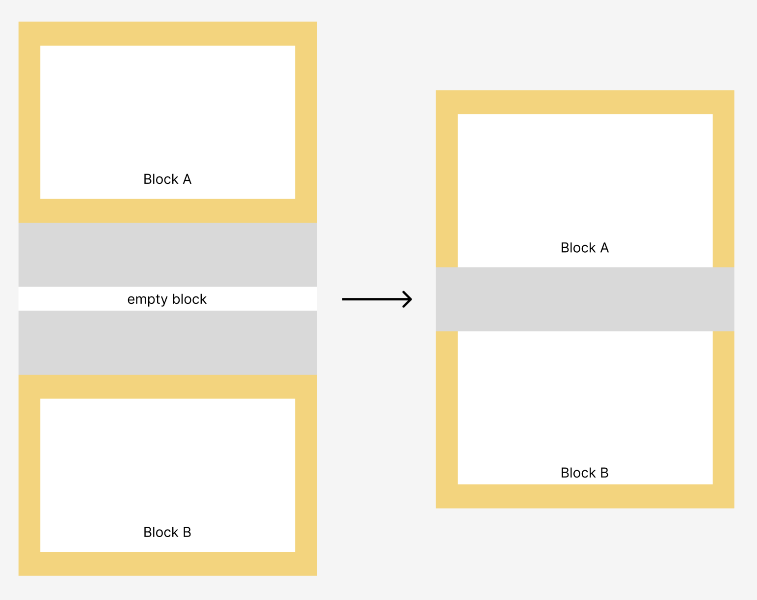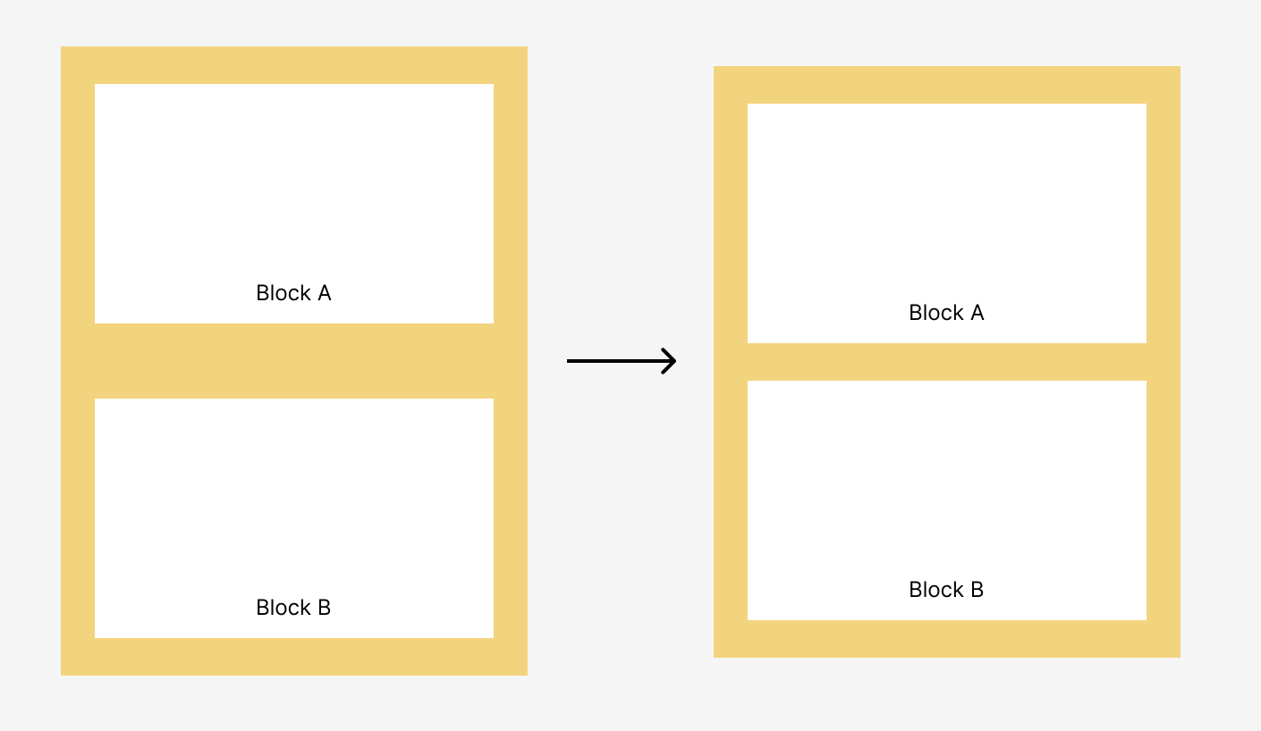 마진 병합, 마진 겹침, 마진 상쇄 등의 이름으로 불리며, 말 그대로 마진이 겹쳐서 합쳐지는 현상을 말한다. 아래 코드를 이용하면 위의 그림과 같은 현상을 확인할 수 있는데, Block A와 Block B에 동일한 margin을 부여했기 때문에 당연히 A와 B가 만나는 부분의 마진이 40px가 될 것 같지만, 사실은 20px의 마진이 생성된다는 것이다.